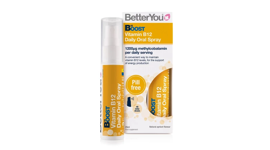 A Better You Boost B12-Vitamin szájspray a tabletták és a kapszulák kényelmesen bevehető változata, mely hatékonyabb felszívódást biztosít a kapszulákkal szemben. Kellemes, sárgabarack ízű.
